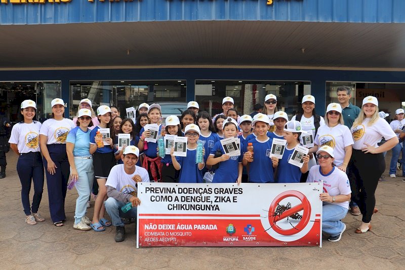 Durante a atividade, estudantes e equipes envolvidas participaram ativamente, uniformizados e portando faixas e panfletos educativos, reforçando as orientações à população. Além disso, foram distribuídas garrafas e bonés personalizados do Projeto Stop Dengue Matupá 2026, fortalecendo a identidade da campanha e incentivando o engajamento coletivo.